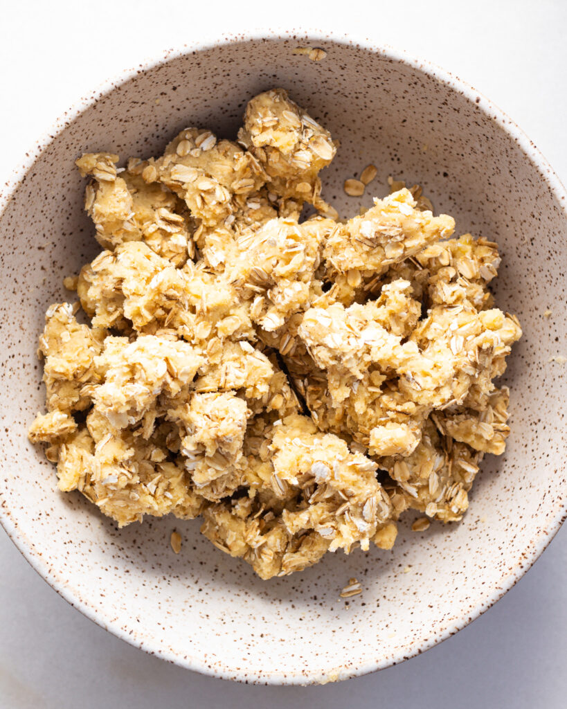 - Transfer the dough to a bowl and add the oats. Mix this together with your hands, letting the dough crumble into big pieces and making sure all the oats are evenly dispersed. Add this to the fridge to chill while the oven finishes heating.