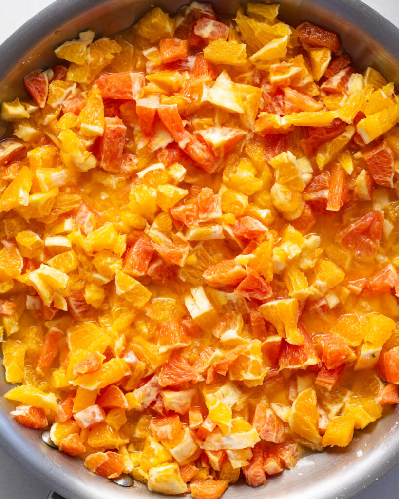 - Peel the oranges. Discard the peels and slice the oranges into bean-sized pieces. Add these directly to an oven-safe 12-inch skillet.