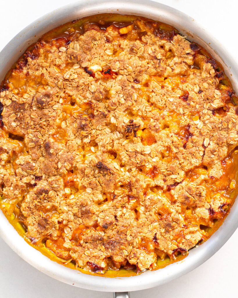 OPTION #2 – Prep and bake ahead, then reheat for serving. Follow the recipe as instructed, then let the crumble cool to room temperature before wrapping in cling wrap. Transfer to the fridge, this will keep for up to three days. When you are ready to serve, preheat the oven to 400°F and warm the crumble in the oven for 10-15 minutes, or until bubbling. Serve warm.