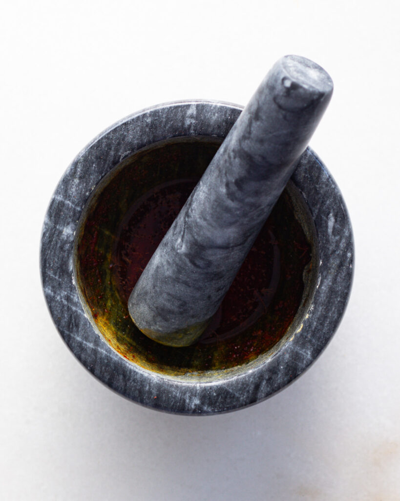Take your saffron threads, grind them into saffron powder using a mortar and pestle, then add an ice cube. Let the ice cube melt, and as it melts it will “bloom” the saffron and bring out its full flavor and aroma. And in a recipe like this orange saffron crumble, that’s exactly what you need.