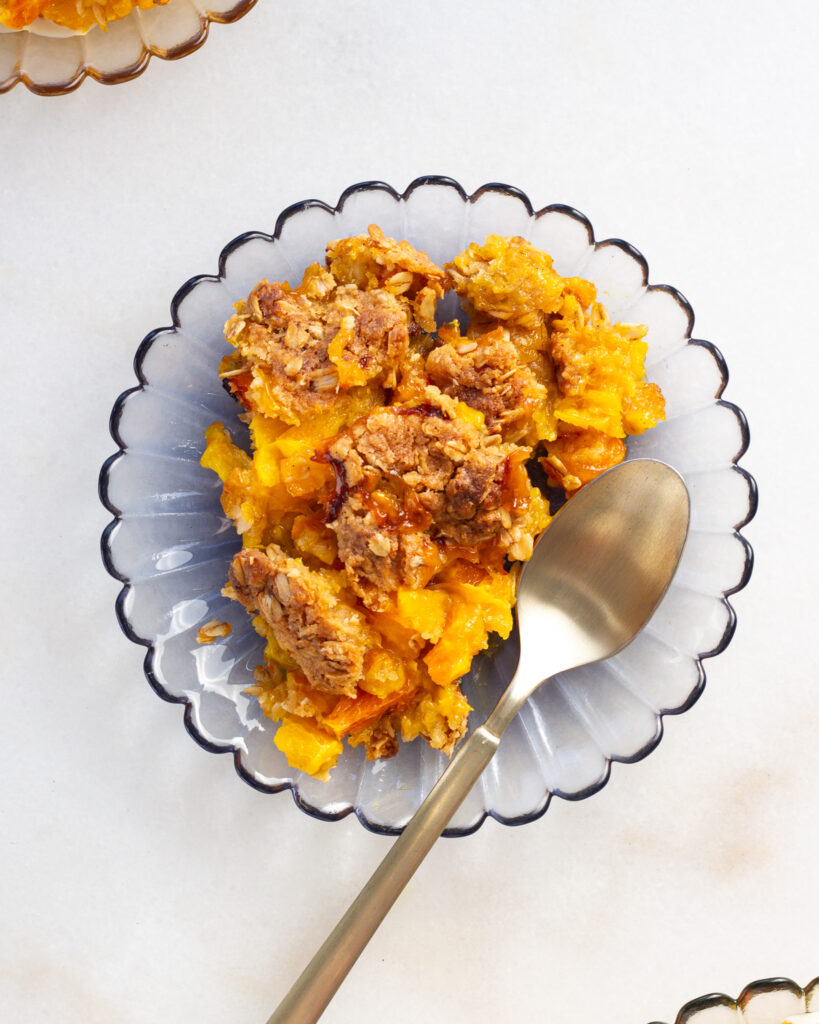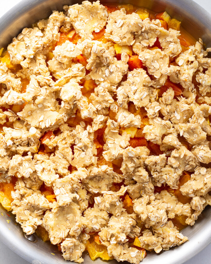 Bake the crumble for 30 minutes at 400°F. Then lower the temperature to 375°F and continue to bake for 35-45 minutes, or until the crumble is deep golden and the orange filling is bubbling and thickened.