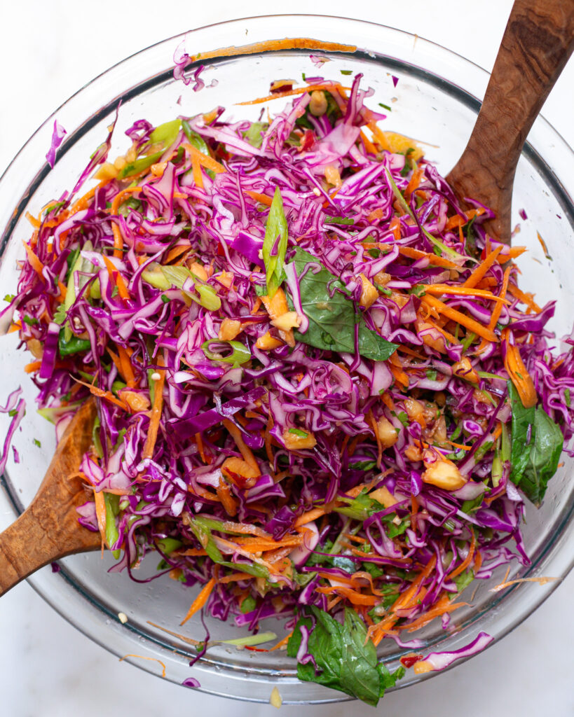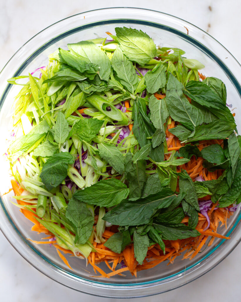 - Use a mandolin to thinly slice the red cabbage, or thinly slice it with a knife. Add it to a large bowl. Thinly slice the carrots and scallions and add them in with the cabbage. Tear in the cup of mint leaves. Mix and set aside.