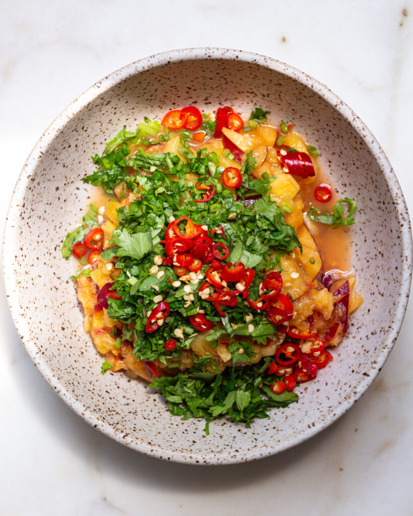 Nước Chấm is traditionally a Vietnamese dipping sauce, made of chilies, vinegar or lime juice, fish sauce and sugar. I took a few liberties here, but the inspiration very much still comes from the classic Vietnamese sauce. It would have felt wrong to call it by any other name, so I wanted to give this peachy, spicy dressing its proper origin, and that is why this recipe is named as such!