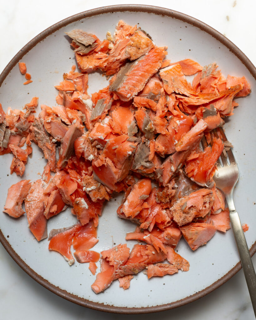 - Flake the salmon off its skin, making big chunks. Set those aside.
