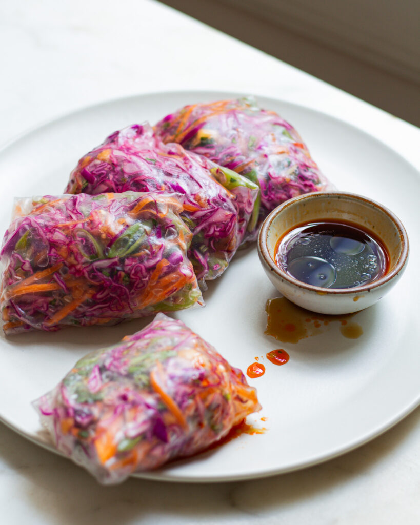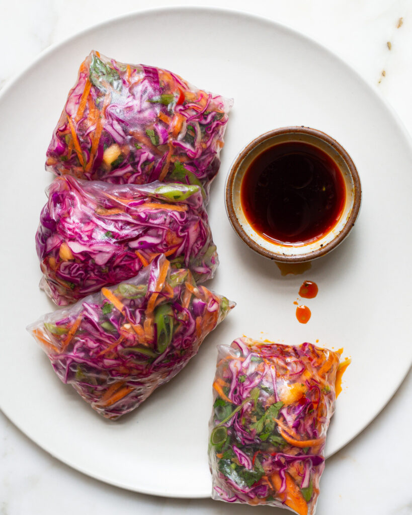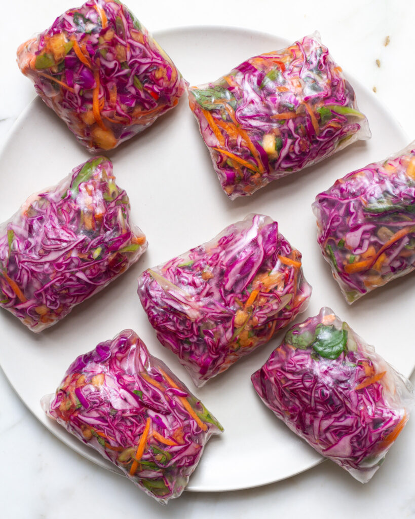 These spring rolls are great for a light lunch, and I’ve found four of them keep me plenty full. I like to nestle four of them together in an airtight container and store it in the fridge. It will keep for up to five days. Just make sure to nestle them on an angle so that they pull apart easily. If they are on top of each other, they run the risk of sticking!
