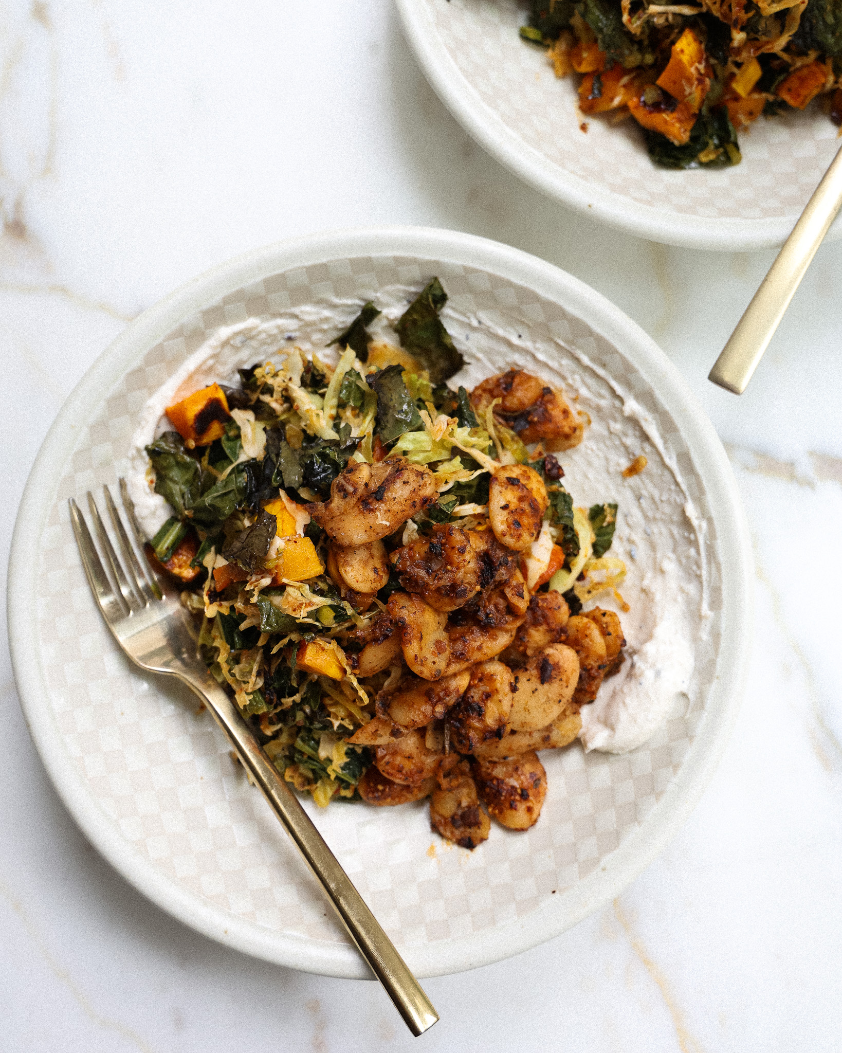 Salsa macha is already textured and nutty with a great depth, so this salad doesn’t need more than that condiment to make it go wild. The sweetness of the squash tempers the heat of the dressing, and creamy labneh will make you want to come back for bite after bite. Also, a great perk is this can be made with either beans or chicken (or both!), so what’s stopping you?