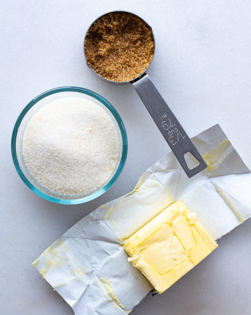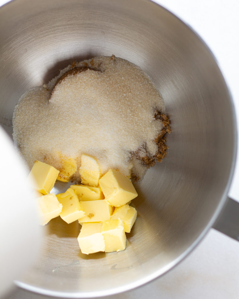 - In a stand mixer, beat together the butter and sugars, scraping down the sides, until the butter mix is light and fluffy, about 3-5 minutes.
