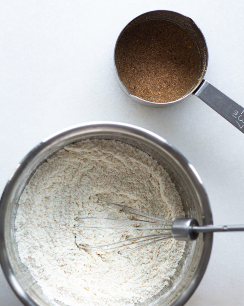 - While this is happening, create the flax egg by whisking together the flax meal and water. Let this sit to form a gel.