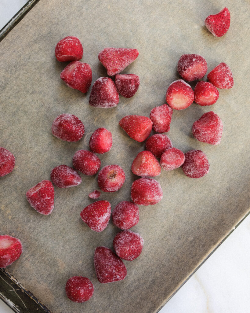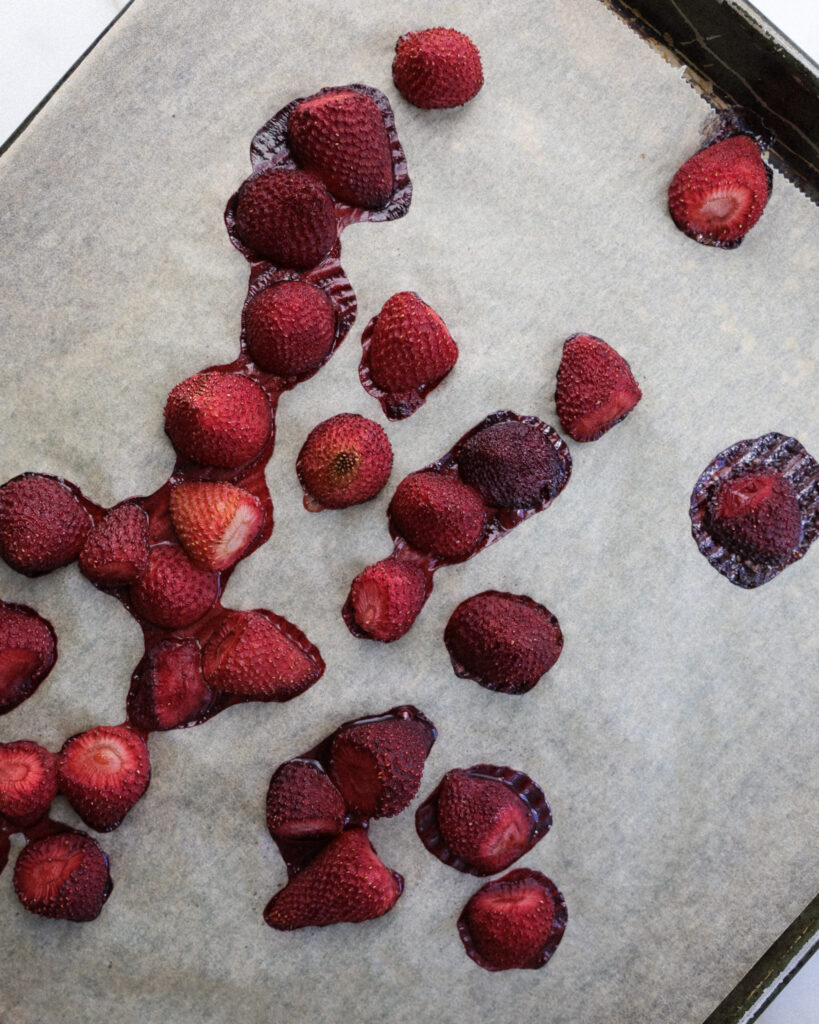 - Add 360 grams of strawberries to a parchment-lined baking pan. Roast for 45 minutes (if using frozen) or 25 minutes (if using fresh). You want most of their moisture released, with the strawberries feeling stiff and firm. Gently mash them into a paste, adding them back into the oven for 10 minutes if there is still too much moisture (see blog image for reference).