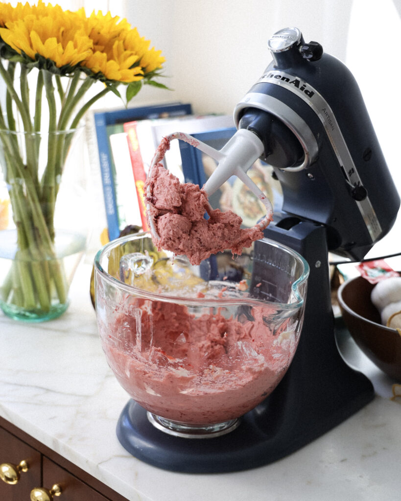 - Add the mashed strawberries to the bowl of a stand mixer along with the butter. Mix on medium speed for 2-3 minutes. It won’t fully mix yet but do the best you can to make a smooth mixture.