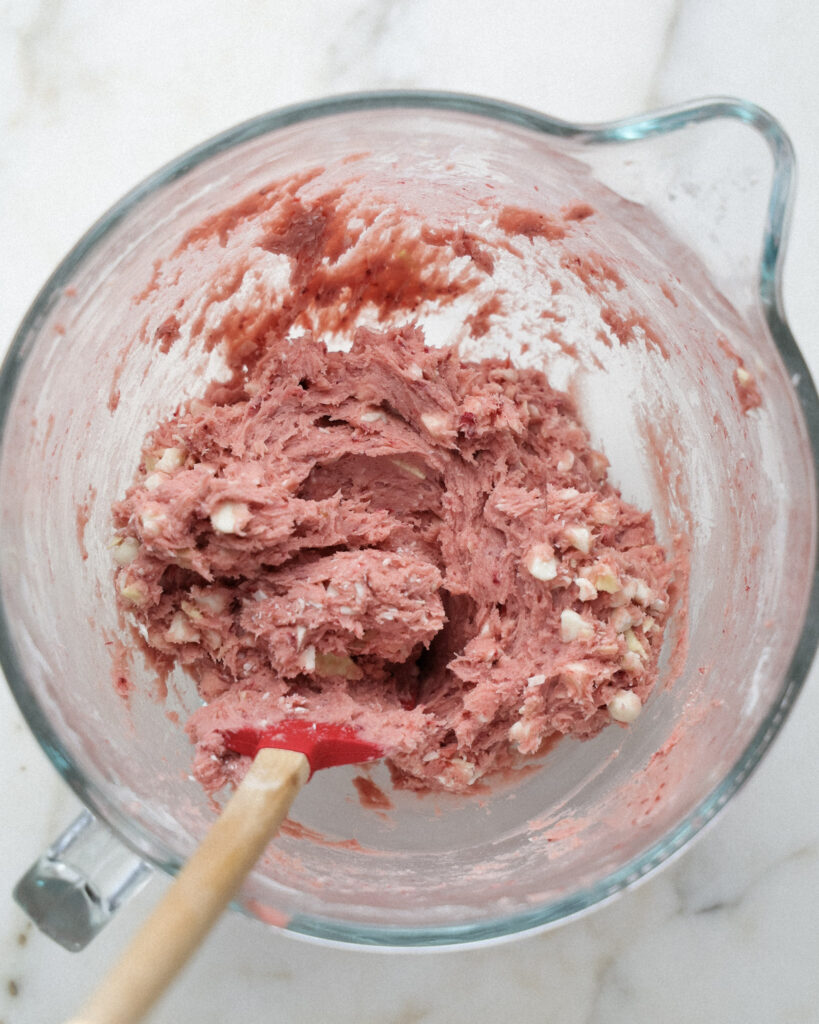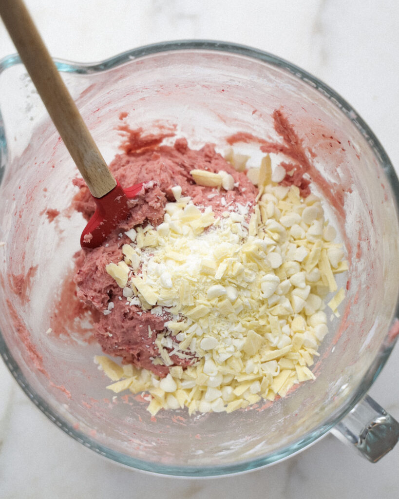 - Add in three fourths of the white chocolate and mix again, reserving some for topping. The dough will be soft, but shouldn’t be unmanageable.