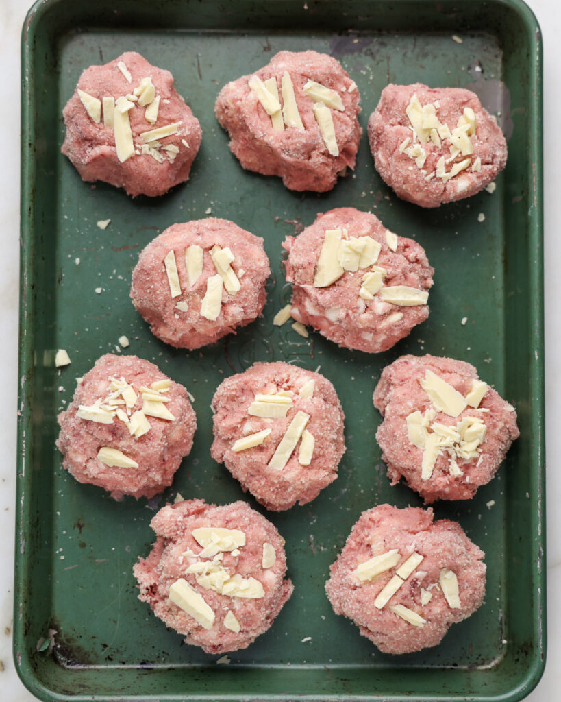 - Scoop the cookie dough into 16 2-ounce balls and roll just their tops in turbinado sugar. Add them to a parchment-lined baking sheet, spaced 2-inches apart, and press the remaining white chocolate chunks on top.