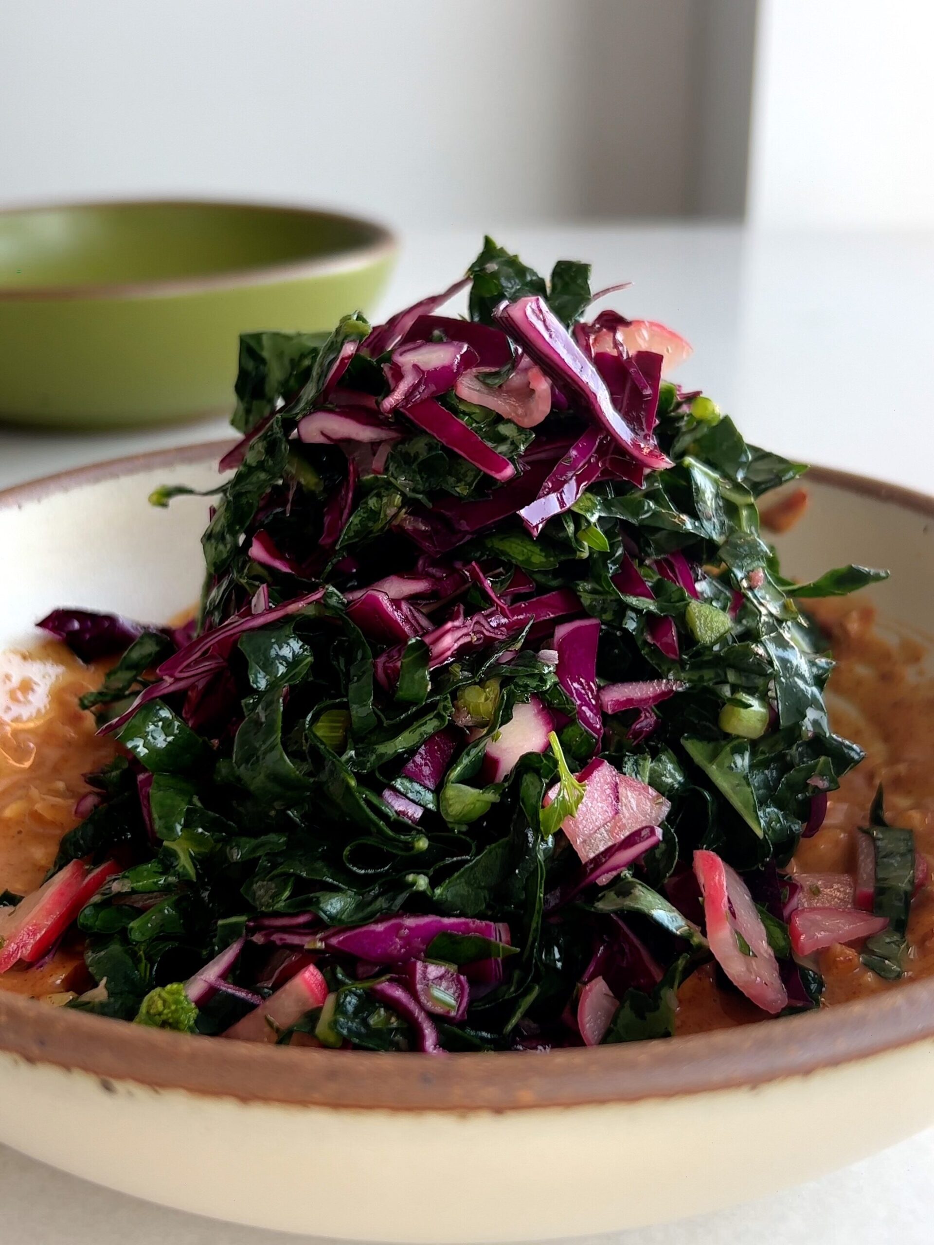 This tangy, rich sambal almond butter salad is one of my favorite salads to make and eat – it’s not your average kale salad, with a creamy, salty almond butter sauce at the bottom and a bright, pickly ginger sauce at the top. Everything melds together to create the best of both worlds, in a really healthy, delicious and balanced salad. The full recipe will be at the bottom of the blog post, and if you’re looking for a quick and crave-worthy salad, I promise, you won’t regret giving nut butter salads a try!