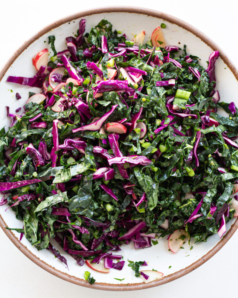 - Add the kale to the pickled ginger dressing bowl and toss, scrunching with your hands to massage the kale and break it down to half its size. When the kale is shrunken and softened, add the cabbage and toss.