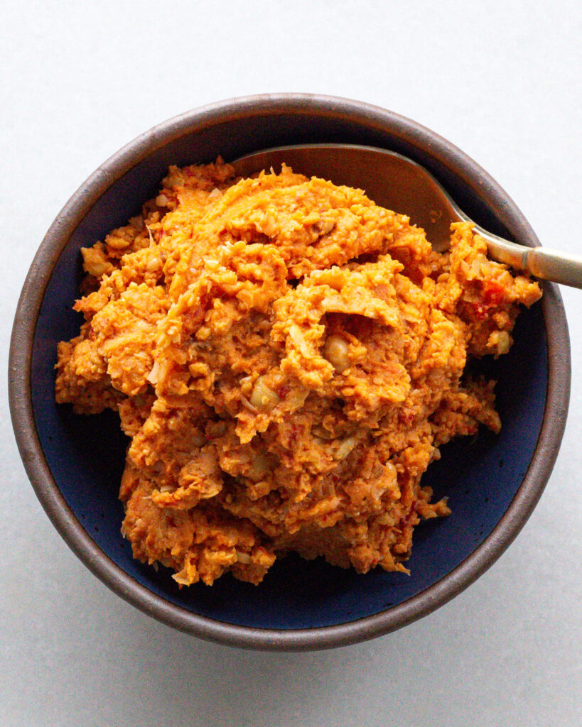 This is the no-cooking part of the recipe, but it probably makes my favorite part of the recipe. Just add the chickpeas, the roasted red peppers, the sun-dried tomatoes, salt, and the juice from 1/2 of a lemon to a food processor. Pulse until almost smooth, but still a bit textured. Set aside.