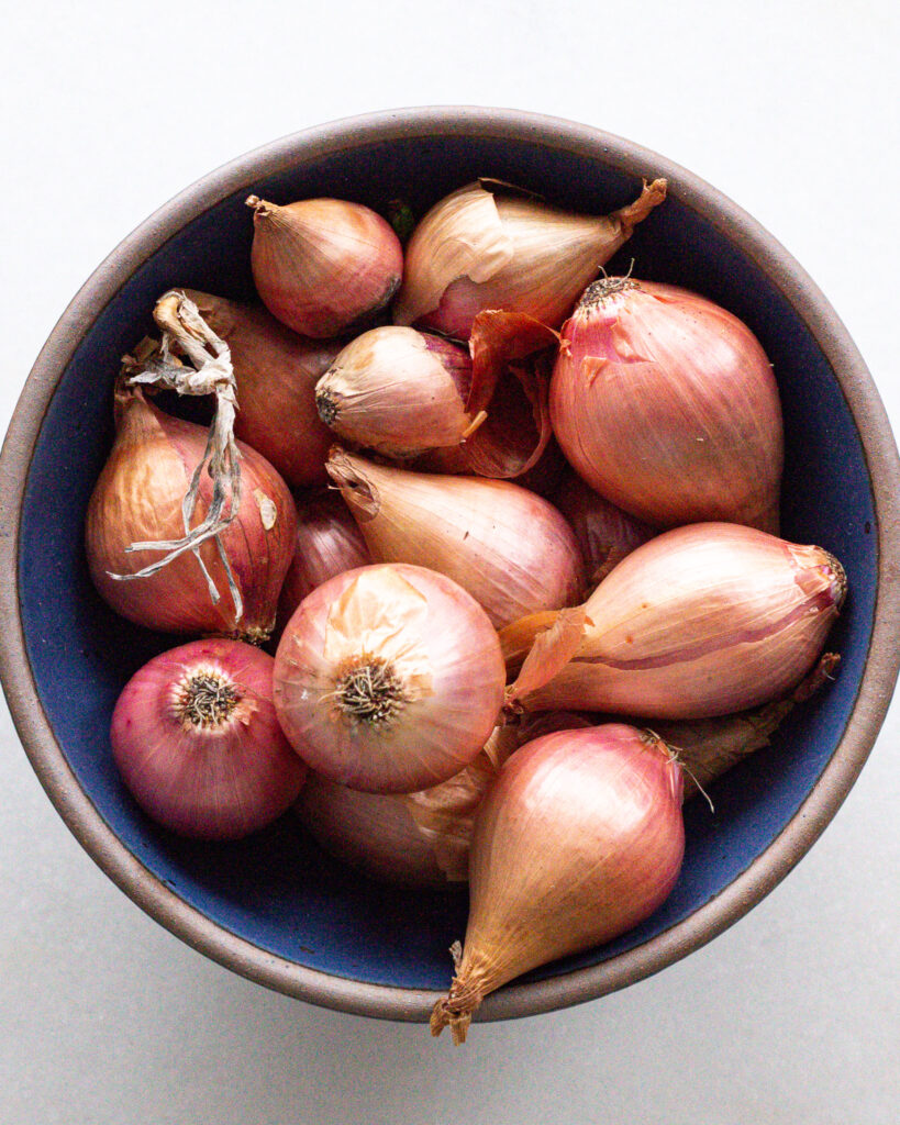- Add the olive oil to a large sauté pan and set it on medium heat. Let the oil come to temperature and then add the shallots. Cook for 4-5 minutes or until their layers start to break apart and they become jammy. Season with salt.