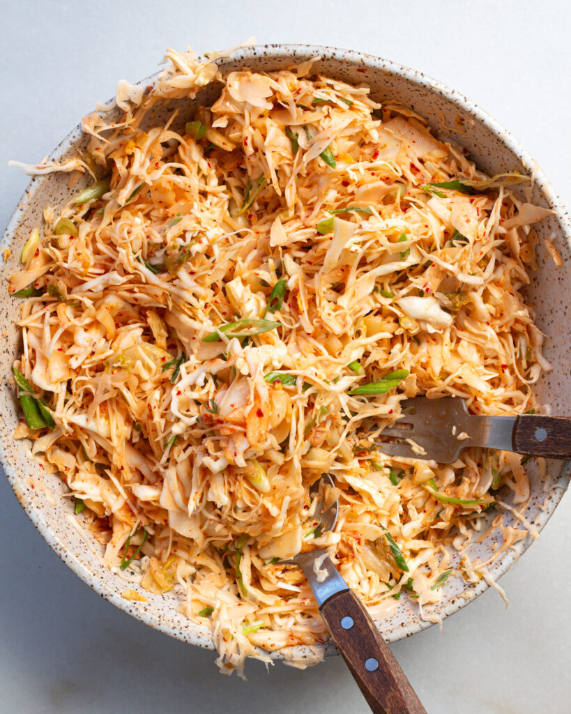 Kimchi is a side dish that is made up of salted and fermented vegetables, and usually one of those vegetables is napa cabbage. So yes, making a kimchi slaw is kind of like putting fermented cabbage on non-fermented cabbage, but that’s part of why I love it.