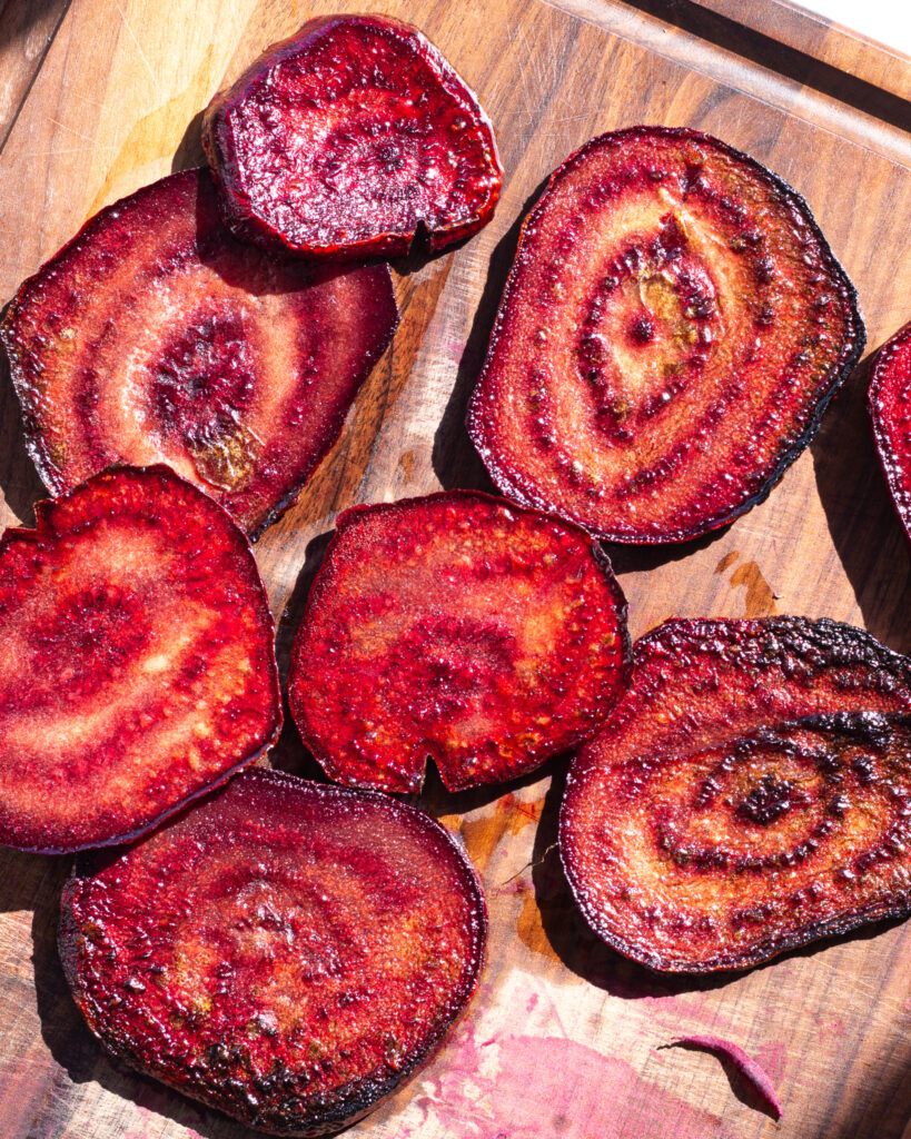 I like to let a cast iron heat up with a bit of olive oil in it. Olive oil has a low smoke point, so as soon as it starts to become “whispy,” I add my beets. I sear them for 4 minutes on each side or until darkened, then flip and repeat. When I take them off the pan I season them with just a touch of salt, and then rinse and repeat.