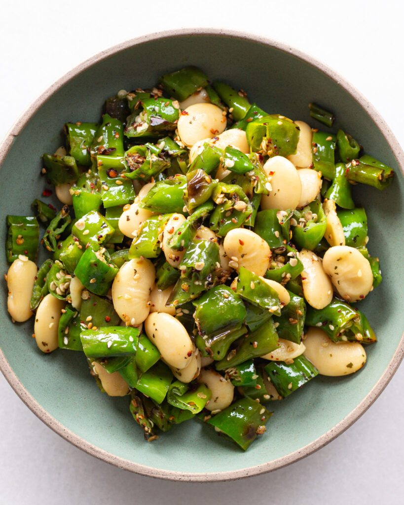 Add the vinegar and honey and stir into the sesame mixture. Taste and season. Then add in the shishto peppers and mix to coat. Add in the butter beans and mix again.