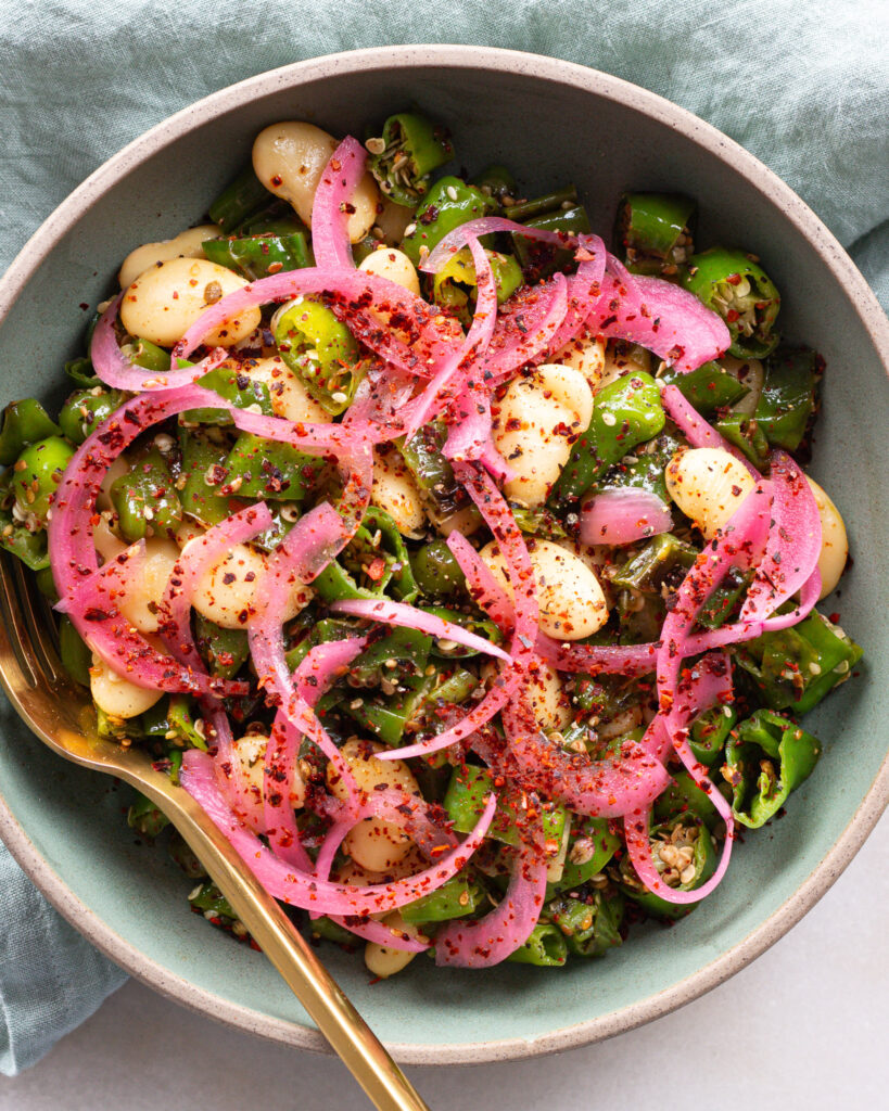 This shishito-bean salad is relatively easy (that’s the whole point!) Just start by cooking the peppers in batches. Blister the shishito peppers. Set a pan over medium heat and add a tablespoon of olive oil. Cook the peppers undisturbed for 4-5 minutes, or until they form char marks, agitate the pan and cook again until all sides are blistered. Transfer to a cutting board.