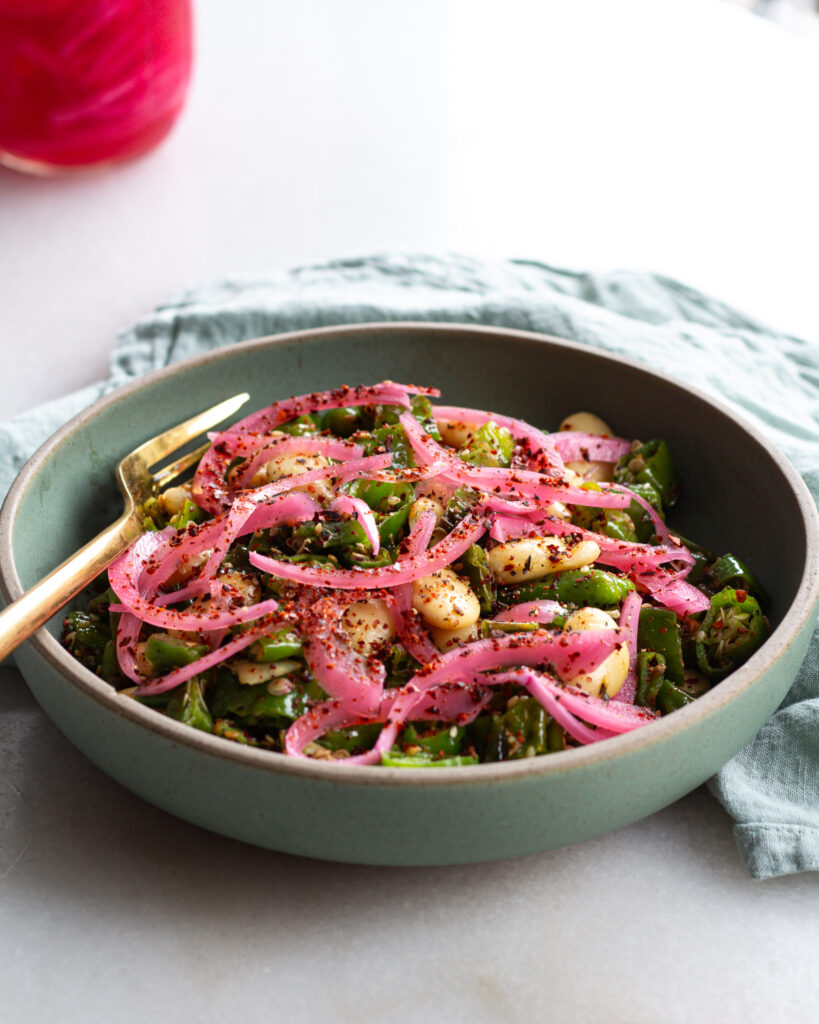 This is my favorite quick and easy dinner if you are looking for something filled with protein, truly nourishing, and packed with flavor. It’s plant-based, easy to make, and surprisingly filling – most likely thanks to the olive oil and butter beans. (Ahem – mediterranean diet who??) But, of course, amid all its flavors, I couldn’t skip the pickled red onion. This salad has plenty of *zing* to it, but the punch of sweet, salty and briny flavor the onions give is simply irreplaceable.