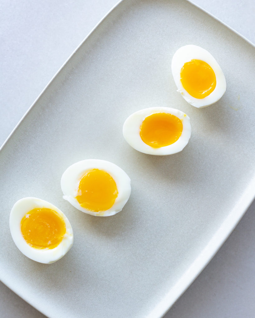 - Bring a large pot of water to boil and prepare an ice bath to the side. Boil one of the eggs for 6 minutes (absolutely no longer) and immediately transfer to the ice bath. Only let it sit there for two minutes, it's harder to peel if the egg is fully cooled. Peel the egg and set it aside.