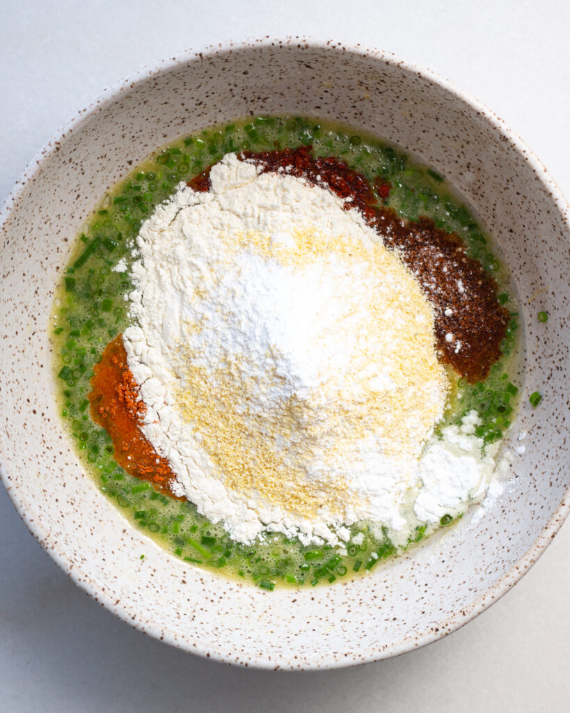 - In a medium bowl whisk together the second egg with the oil and milk. Add in the flour, cornmeal, baking powder, salt, and spices. Mix until you have a thick batter, then fold in the chives.
