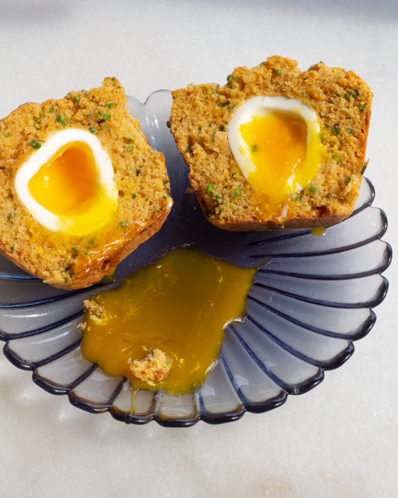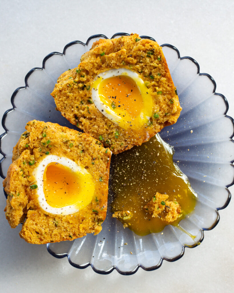 This is my big secret (and did I cry over many under-boiled eggs while testing this recipe? Yes. Yes I did). But you don’t have to boil your eggs for an insanely low amount of time. 5-6 minutes is perfect, with 6 being my sweet spot! This is because as the egg is nestled in the batter, it is protected from the heat of the oven. So even if you’re making only one, the egg still won’t overcook. You just want it to start as jammy as possible, and then hopefully it will stay that way!