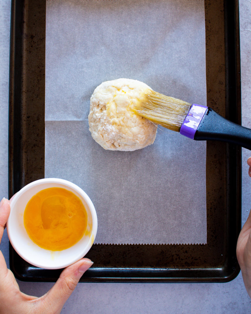 - After your biscuit is formed, put it on a parchment lined baking sheet and brush with more melted vegan butter or egg wash if you are not vegan.