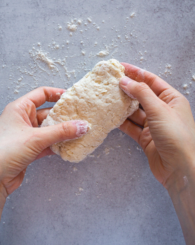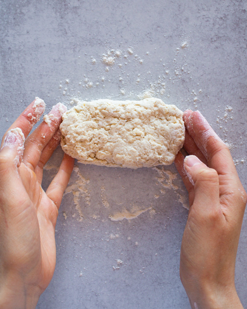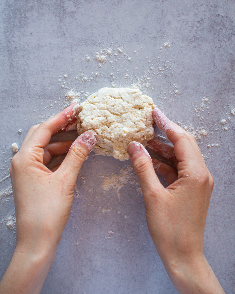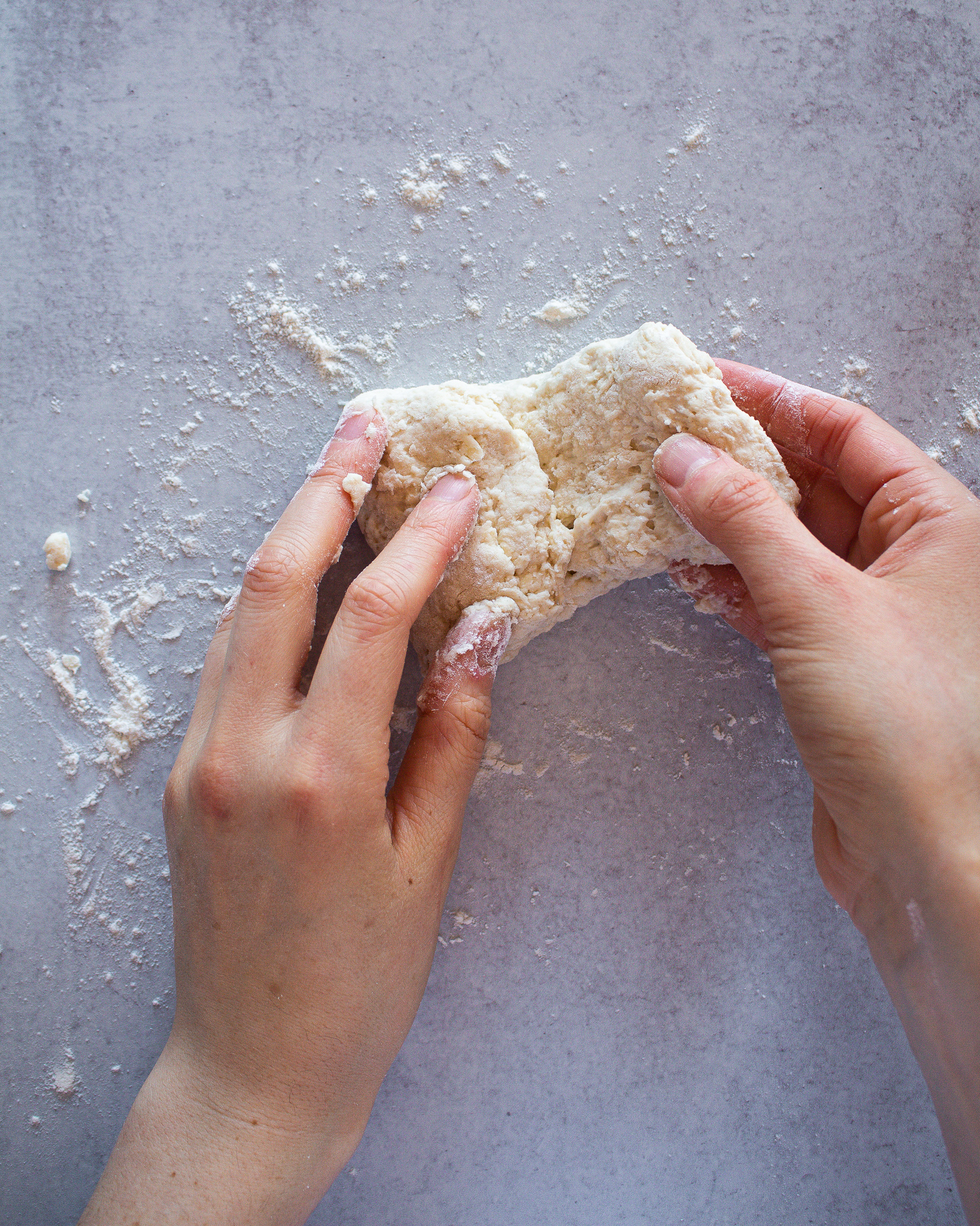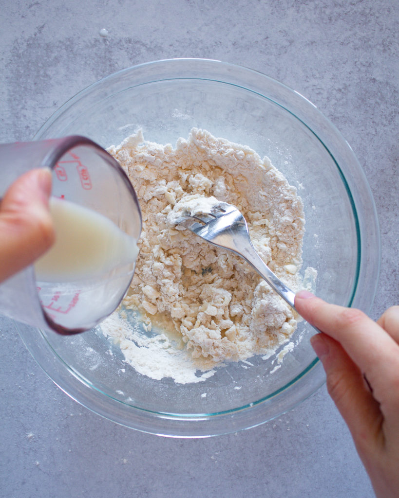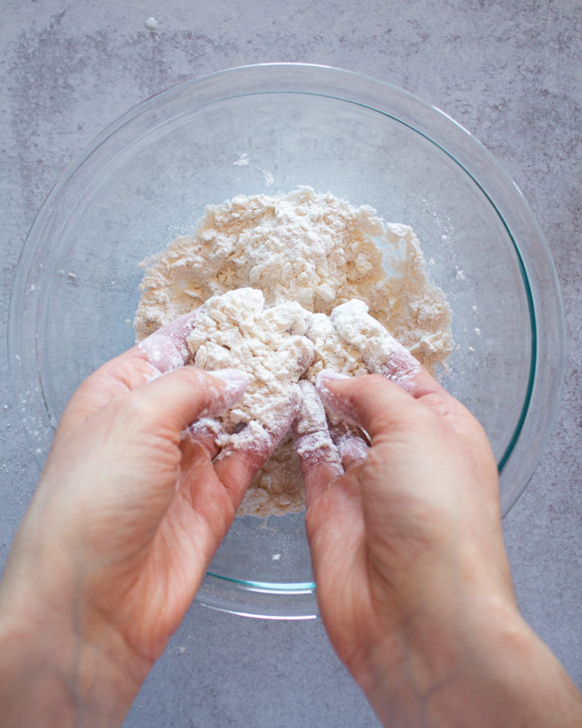 - Using a fork and whisking constantly, gradually drizzle in the ice cold milk. Whisk until you get a rough dough, then switch to using your hands to bring the dough together. Try to use your hands as little as possible in order to keep the dough cold!