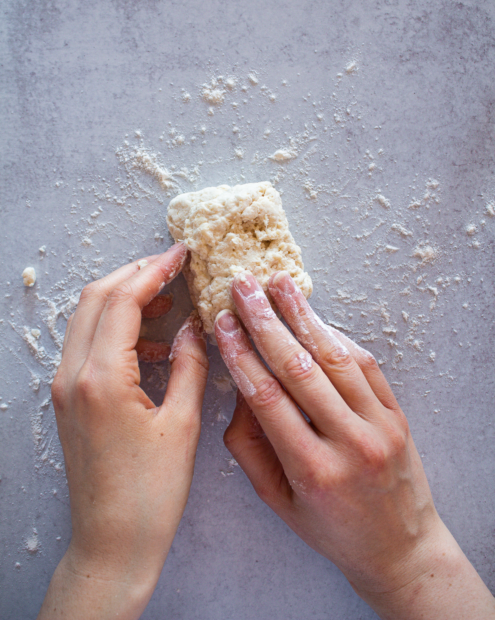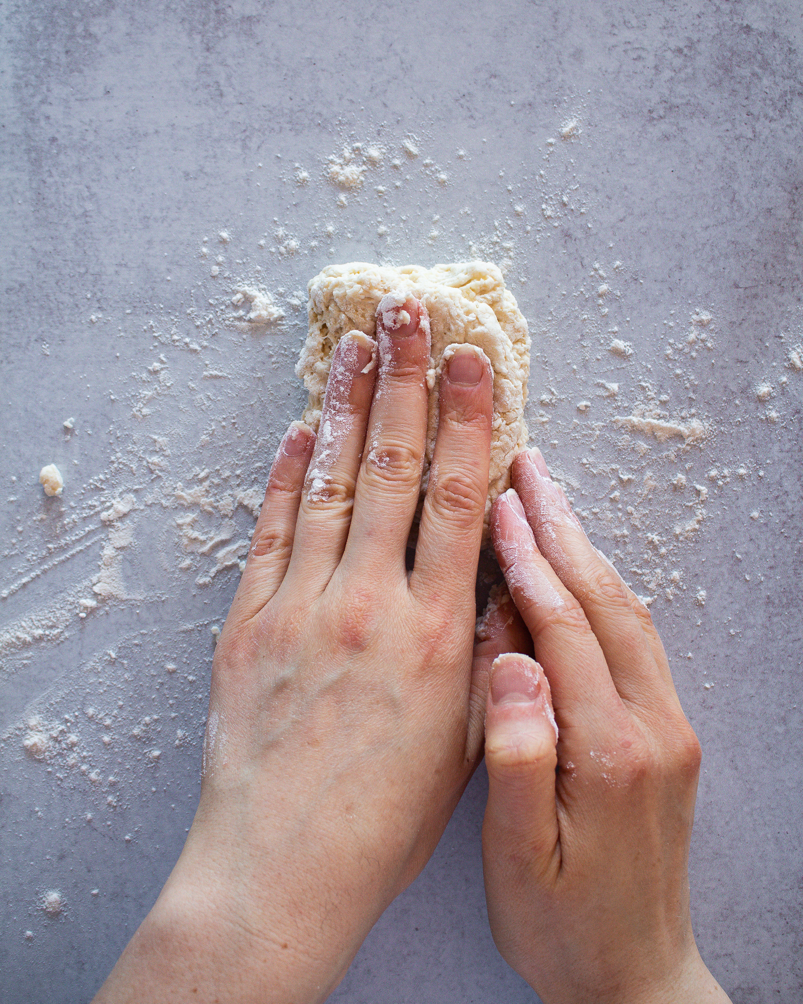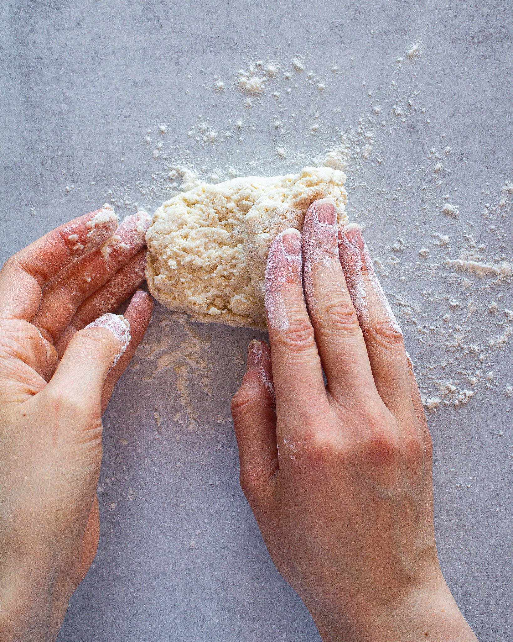 Now it is time to form the final biscuit! Your surface flour should be mostly gone, so we will use this to our advantage.