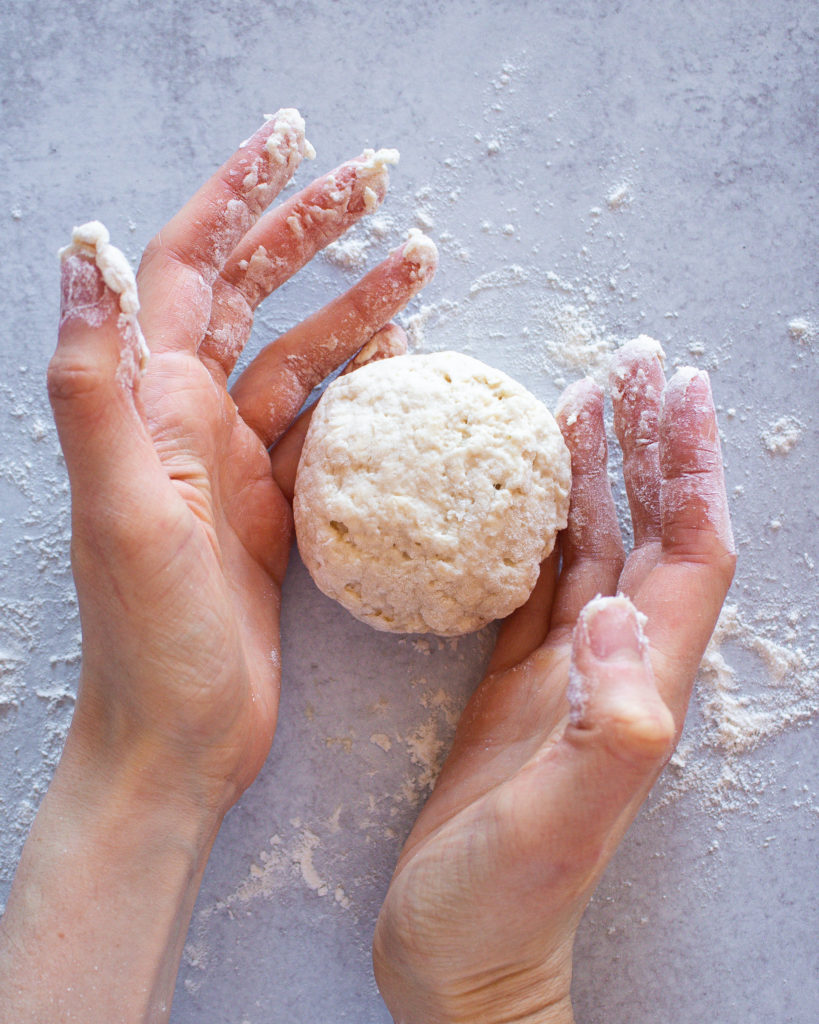 - Once you've done a few folds, use both hands to gently rotate the dough and then pull it towards you. Most of the flour on the counter should be gone, so the bottom of the dough should lightly stick, and when you pull it towards you it will tighten. This is to tighten up the bottom of the biscuit and create a circular shape.