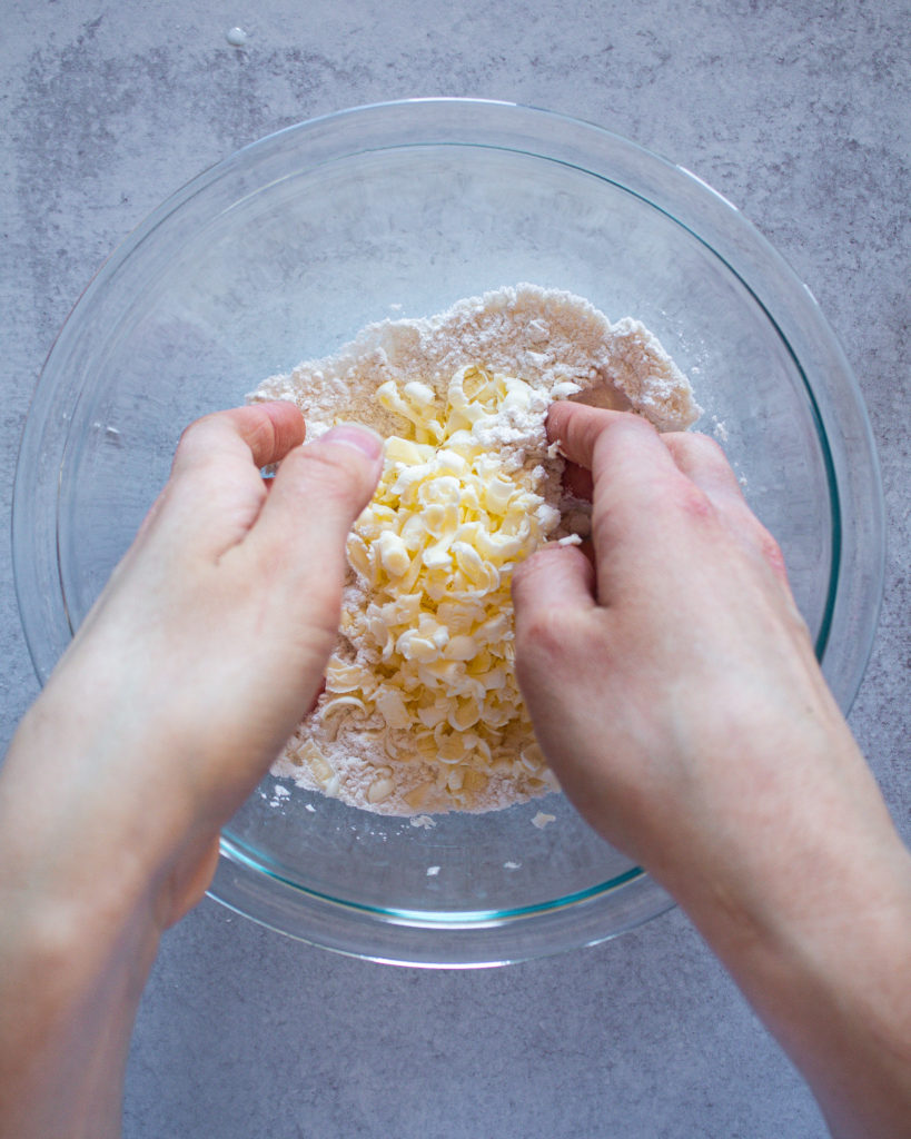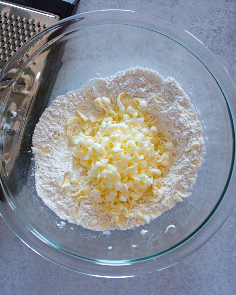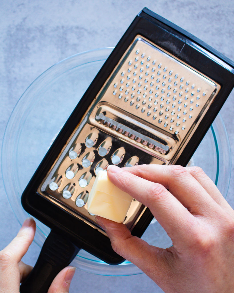 - Use a box grater to grate the butter into the flour. Once grated, toss with your fingers until all the butter pieces are coated in flour. After the pieces are coated, mix with your fingers until no piece of butter is bigger than a lentil.