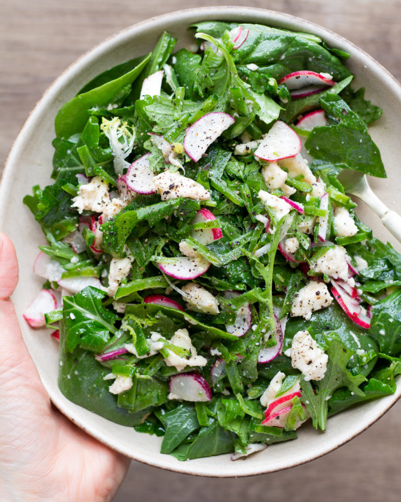 And this fresh-af salad is like spring in a bowl. It’s just fresh mozzarella, radishes, peas, fresh greens and salt and pepper! You can toss in some crunch with almonds or croutons, and then you are good to go. It’s not an exact recipe at all, but just a little salad inspo if you need it!