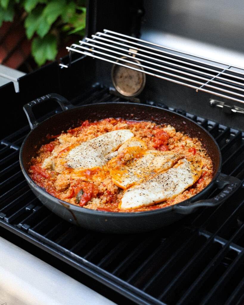 From there, season the tilapia on both sides, then nestle the uncooked tilapia on top of the quinoa, cover with a lid (or the grill top, if you’re grilling like me!) and let the tilapia steam on top for 6-8 minutes or until cooked through.