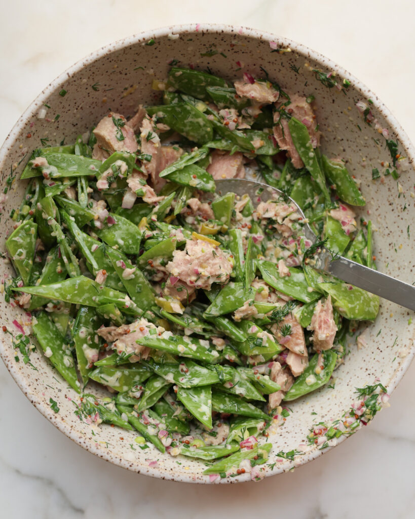 - Add the snow peas to the bowl with the dressing and mix, then flake in your jarred tuna. Mix and taste and season with more salt and ground pepper as preferred.