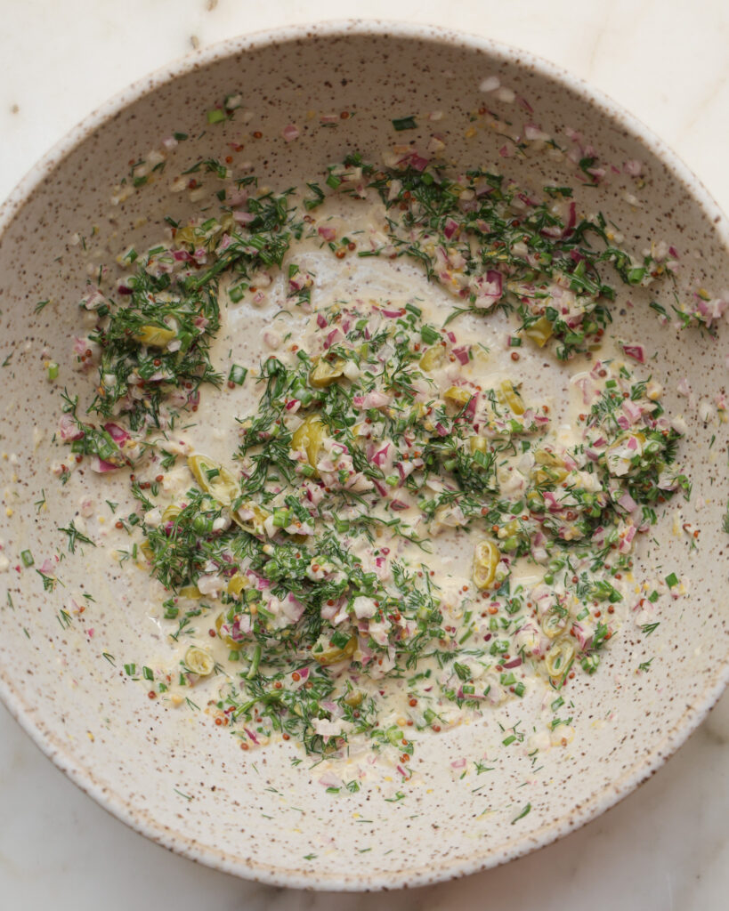 - In a large bowl, add 2 tablespoons of Kewpie mayonnaise and 1 tablespoon of stone ground mustard. Zest in 1/2 teaspoon of lemon zest and squeeze in 3 tablespoons of lemon juice (about the whole lemon). Add the chopped red onion, dill, chives and peppers.