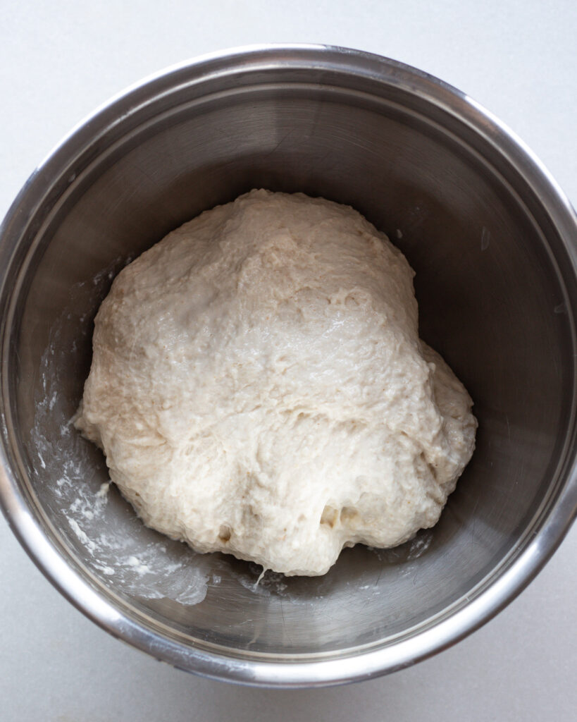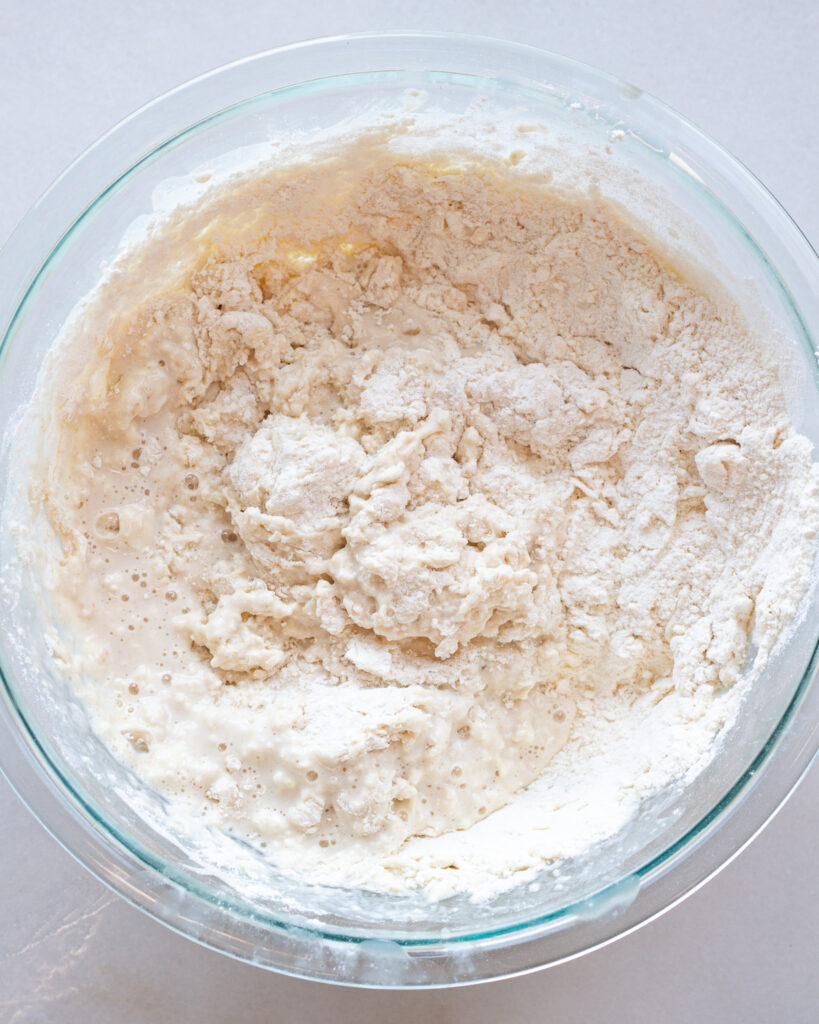 Then add the flours and mix with your hands to combine. Do a few scoops and folds of the dough in the bowl until the dough is smooth, then cover and let rise for 8-12 hours or until doubled in size and bubbling at the top. You want the dough handled enough to be smooth, but you don’t need to knead it like crazy.