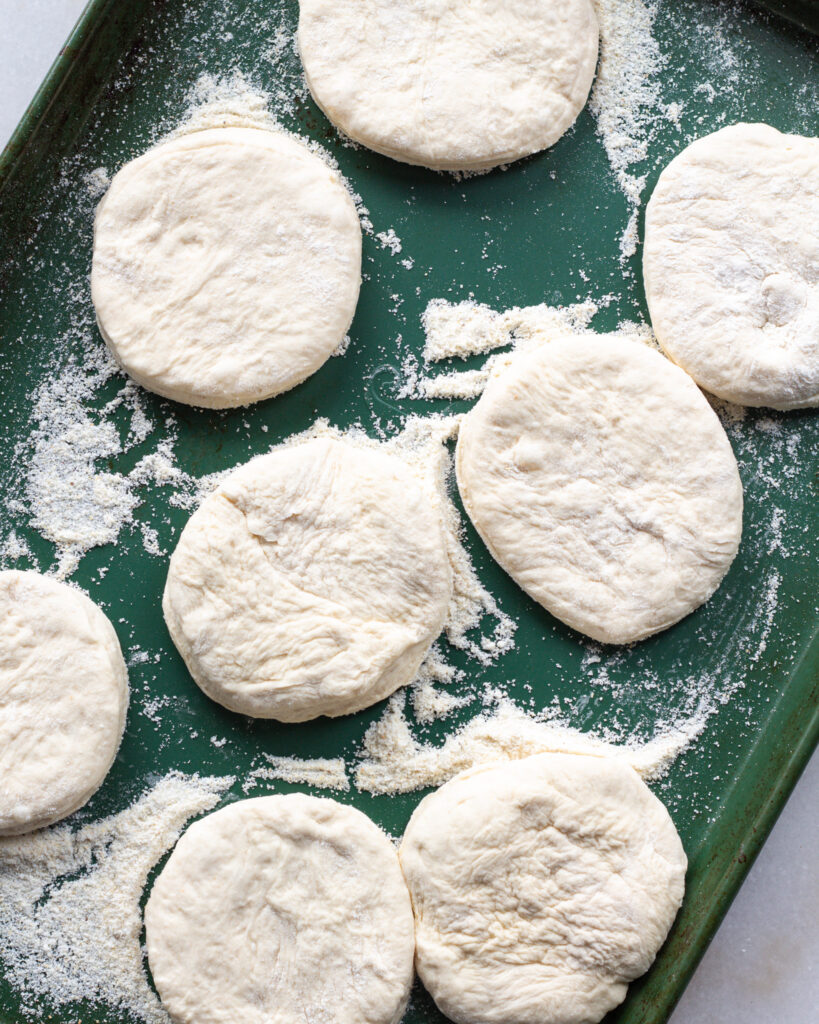 Move the dough to a lightly floured surface, gently pull it into a rectangle and press down until it is 1-inch tall. Use a round cutter to slice into 8 even circles, each about 4 inches in diameter. Press together and re-roll out any remaining dough as needed to get 8 circles.