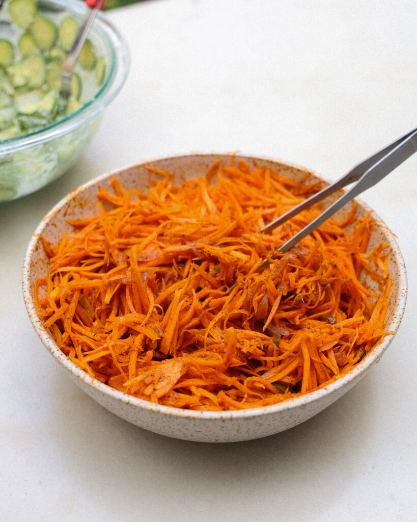 To store this recipe, I suggest mixing the carrot slaw together fully. To preserve peak freshness with the cucumber salad, I suggest mixing the dressing only when you plan to eat. BUT if that’s too much work, mixing it with the dressing before hand is no big deal.