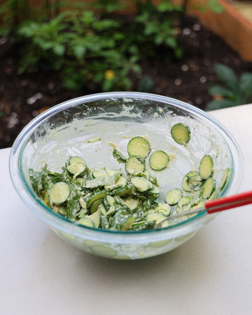 - Thinly slice the cucumbers and add them to the bowl. Tear in the mint leaves and cilantro and mix. Taste the salad and add more salt or lemon juice as preferred.