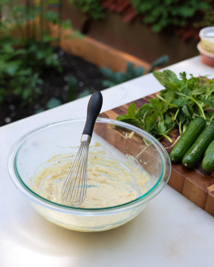 - For the cucumber salad: Into a medium bowl, grate three garlic cloves, add three tablespoons of tahini, 3 tablespoons of lemon juice, 1/2 teaspoon of salt, 1/2 teaspoon of freshly ground black pepper, 1 tablespoon of olive oil, and mix into a dressing.
