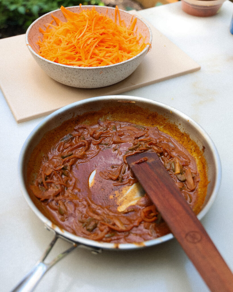 I might be missing it, but the 3 grated garlic cloves for the carrots – are those intended to be cooked along with the jalapeño and red onion, or added raw?