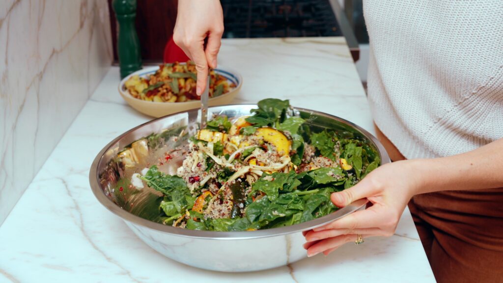 When we make the dressing in the bottom of the bowl, put the quinoa and roasted vegetables in next, then finish off with the leafy greens and toppings, it makes it so that this salad can sit for a while (even overnight in the fridge!) and be ready for tossing right at the last second.