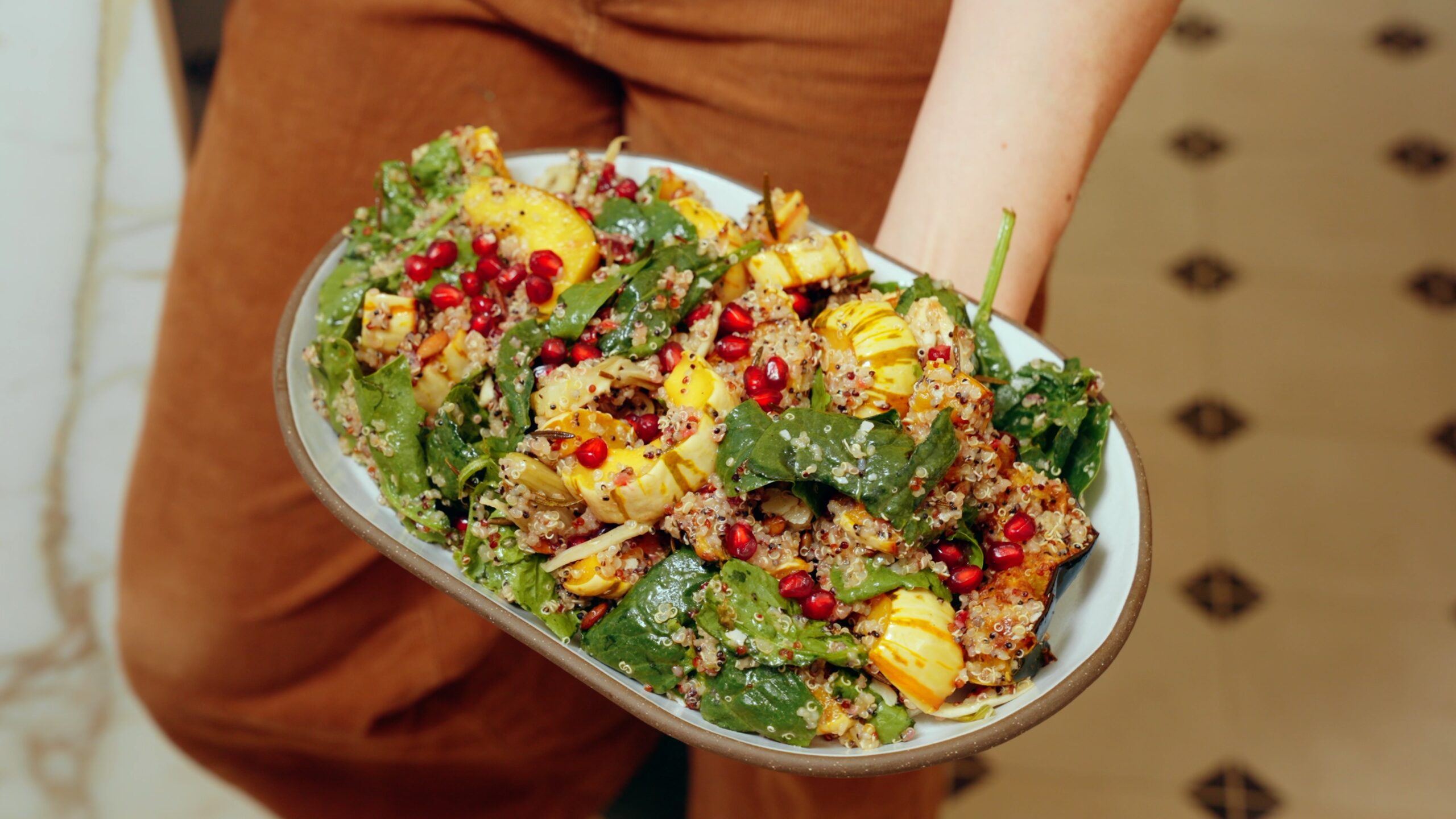 Don’t mix it. Assemble it mason-jar-style (see the section above) where the dressing is on the bottom, then the quinoa, then the roasted vegetables, then the fried sage and pepitas, then the spinach, parmesan and pomegranate seeds. Cover this in plastic wrap, but make sure everything has reached room temperature so the salad doesn’t steam. Store this in the fridge until you want to toss and serve. It will keep for about 12 hours.