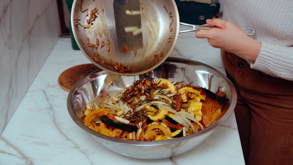 - Now it’s time to assemble. To the bowl with the dressing, add the quinoa, the roasted squash and fennel, then spoon in the fried rosemary and pumpkin seeds, scooping them away from the butter in the pan. (Store the butter in the fridge and use it as rosemary butter throughout the week).