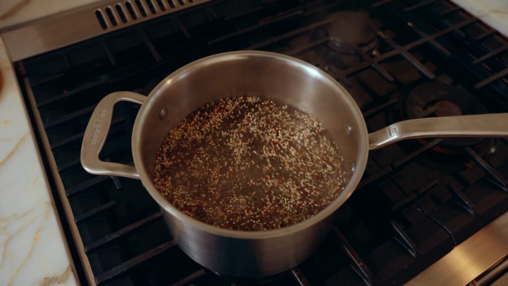 - In a small pot or rice cooker, cook the quinoa according to package instructions and set aside.