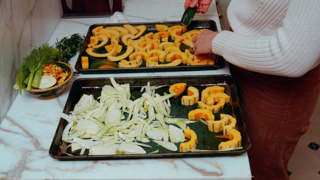 Both the squash and fennel get cooked here, just to roast them into their sweetest state. Don’t crowd the pan, all the squash needs to be touching the pan’s surface. If that means you have to move some squash to the fennel pan, don’t sweat it.