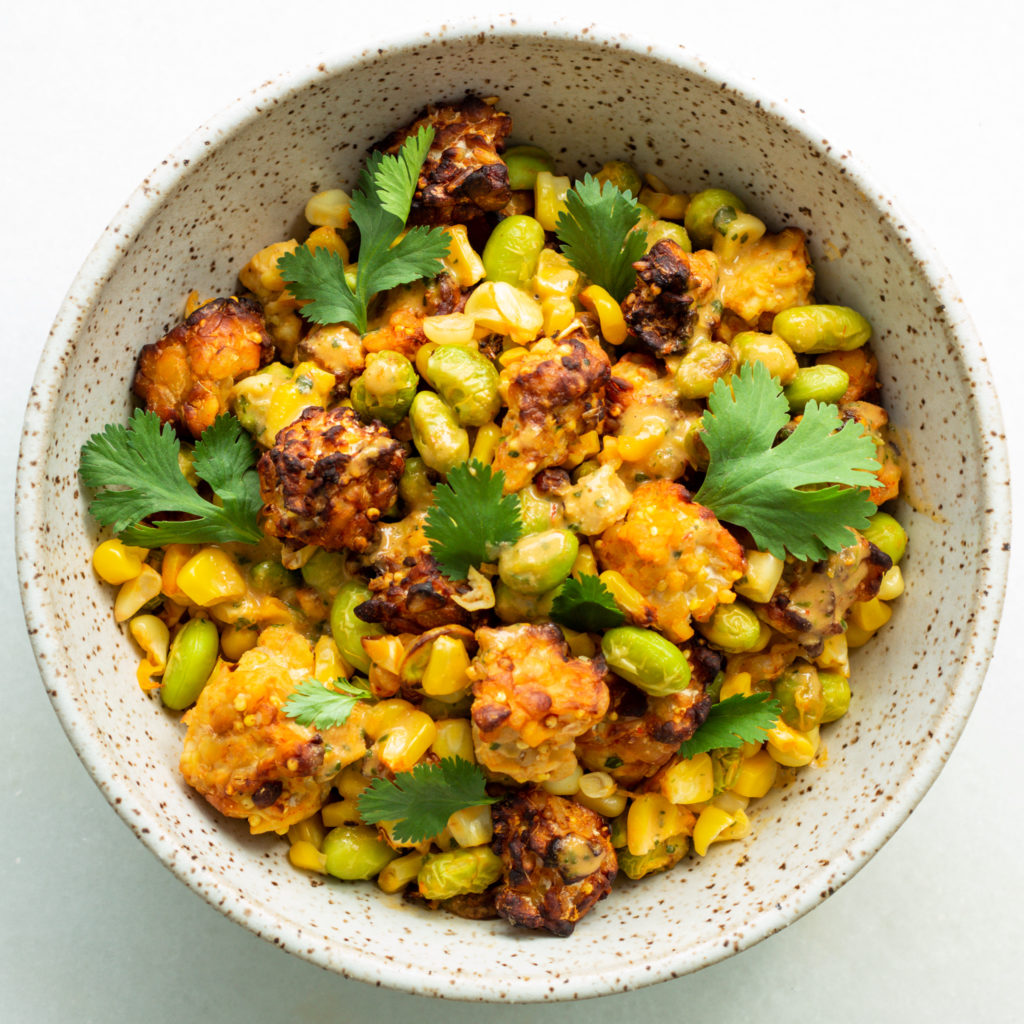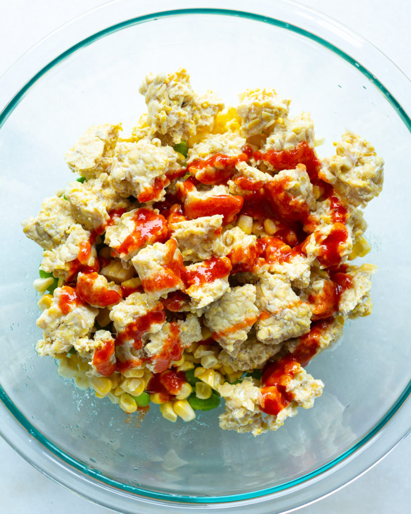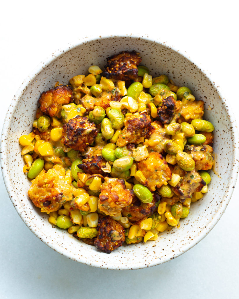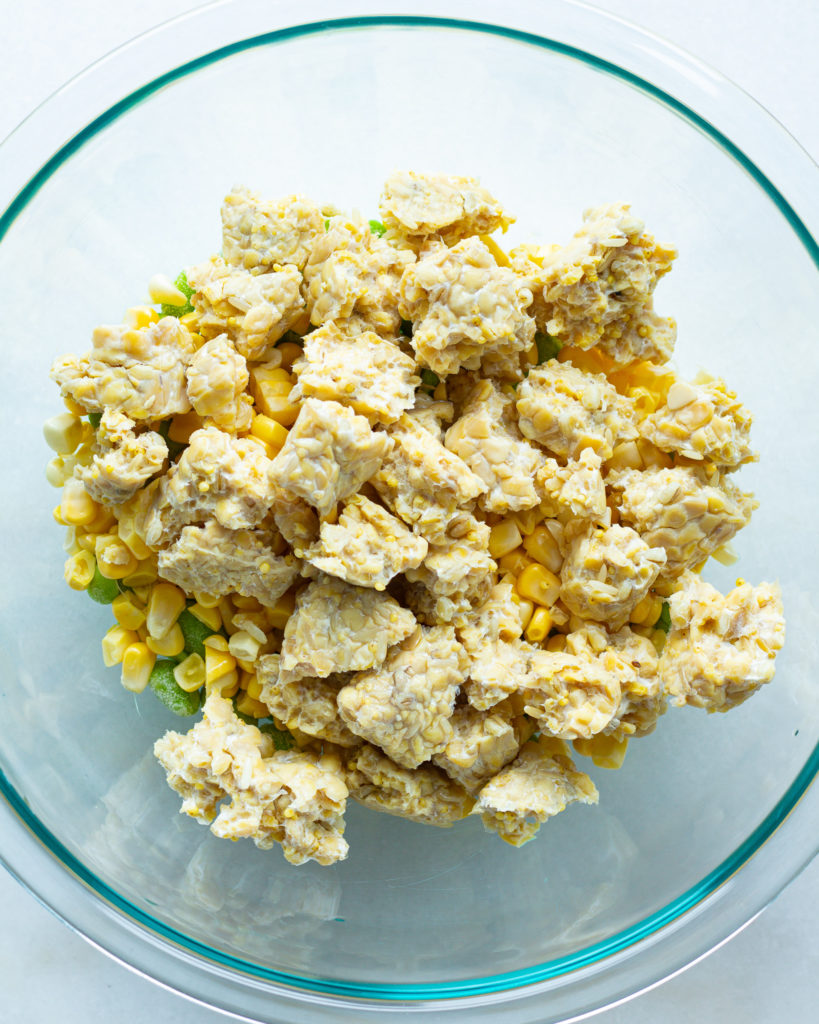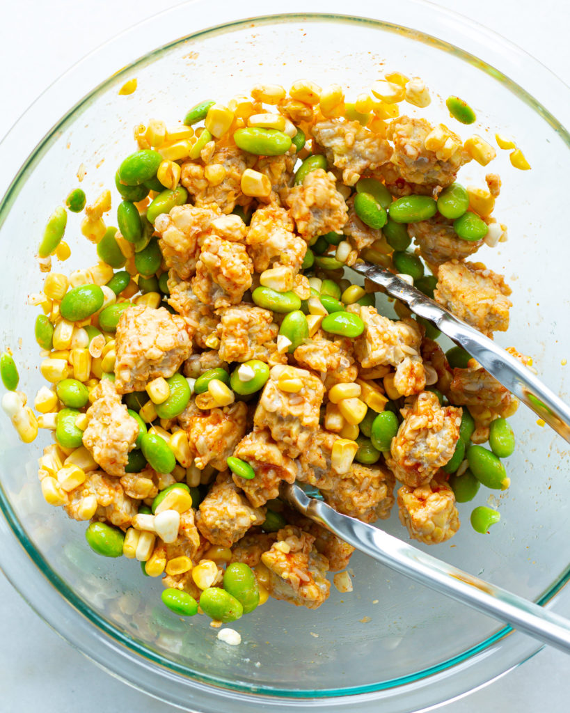- Add the edamame and corn to the tempeh. Toss to combine.