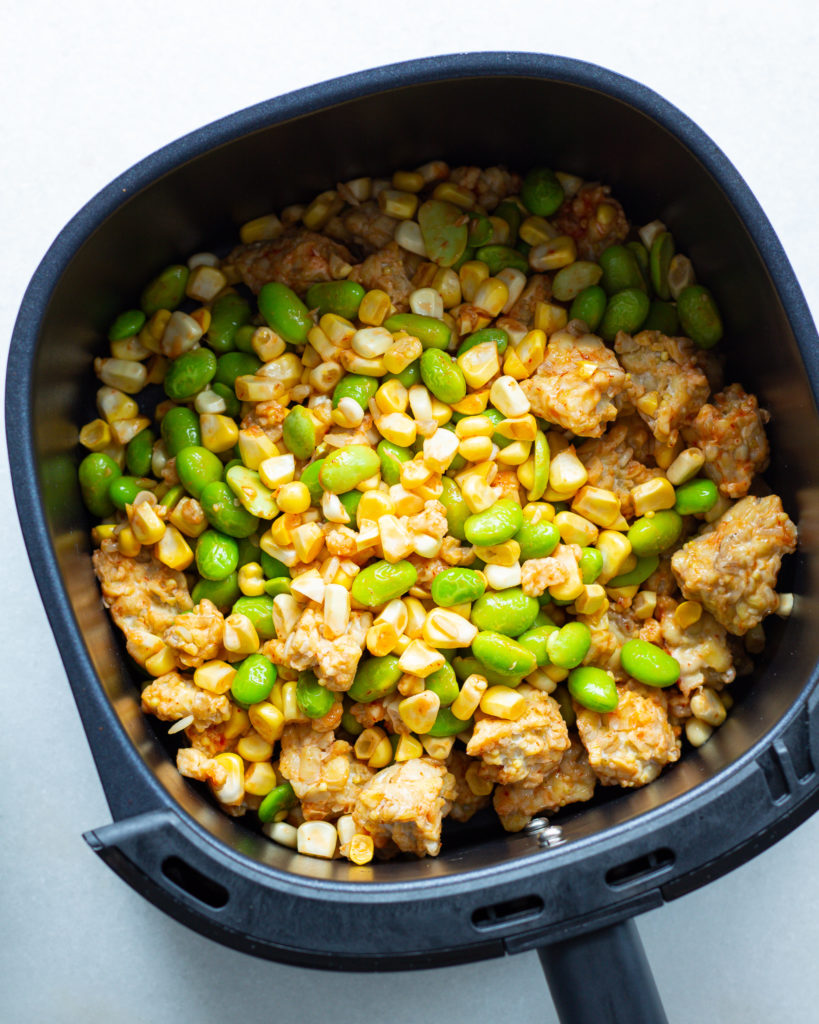 - Spread out the tempeh, edamame and corn evenly in an air fryer basket. Make sure not to crowd the basket, cooking in two batches if necessary.
